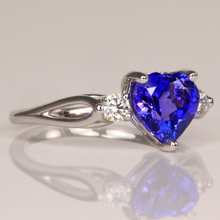 Ladies' 14kt white gold tanzanite ring, with one blue violet vivid (30/%blue/70%violet) color, GIA Type I Clarity VS1, heart-shape brilliant tanzanite. The tanzanite weighs 1.96 carats, measures 8.1 mm wide by 7.9 mm long by 4.9 mm deep, and is 3 prong set. In addition, there are two prong set round brilliant cut diamonds, F-G color, VS2-SI1 clarity, measuring 3 mm wide by 3 mm long with a total weight of .20 carat. The ring weighs 3.86 grams. Tanzanite is color enhanced by heating.