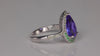 14k white gold tanzanite ring designed by Johny Vinay, with one blue violet exceptional (25%/75%) color, GIA Type I Clarity FLAWLESS TO VVS, pear-shape brilliant cut tanzanite. The tanzanite weighs 3.73 carats, measures 7.8 mm wide by 13.2 mm long by 5.9 mm deep, has very good cut, very good polish and very good symmetry, and is prong set. The tanzanite is color enhanced by heating. In addition, there are eighteen prong set round brilliant cut tsavorite garnets, VIVID GREEN color, VS clarity, measuring 1.5 mm wide by 1.5 mm long with a total approximate weight of .30 carat. The ring also has twenty-three prong set round brilliant cut demantoid garnets from Madagascar, LT. GREEN color, VS clarity, measuring 1.5 mm wide by 1.5 mm long with a total weight of .35 carat. The accent stones weigh a total of approximately .65 carat. The ring weighs 6.16 grams. The overall quality rating of this stone is 919 out of a 1000.