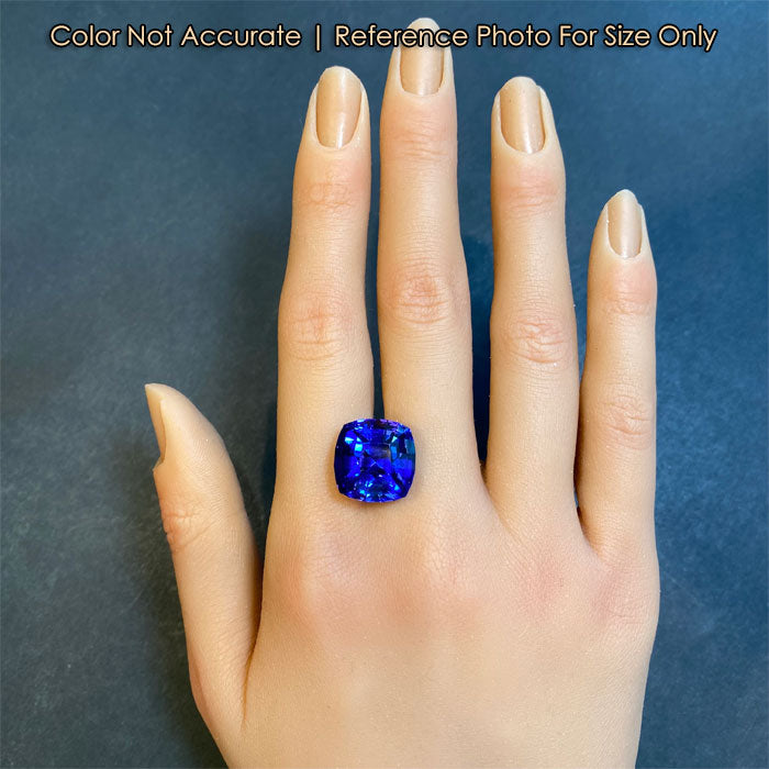 One 20.12 carats square cushion tanzanite, violet blue exceptional (25%violet/75%blue) color, VS1 clarity, cut grade excellent, measuring 14.4 mm wide, 14.6 mm long, 13.2 mm deep; with excellent polish and excellent symmetry. Cut by Steve Moriarty. The overall quality rating of this tanzanite is 975 out of 1000. Tanzanite is heated to enhance its color.